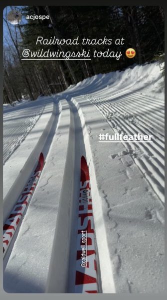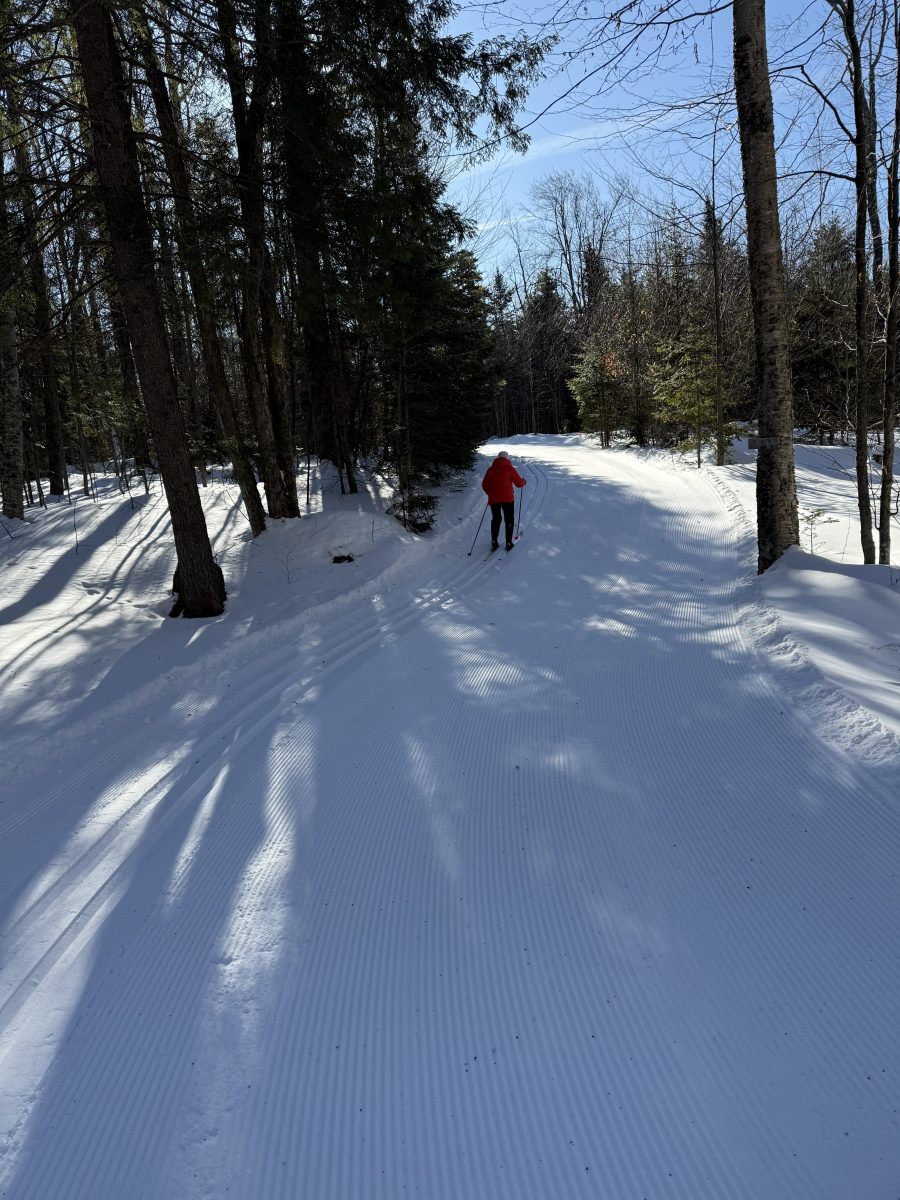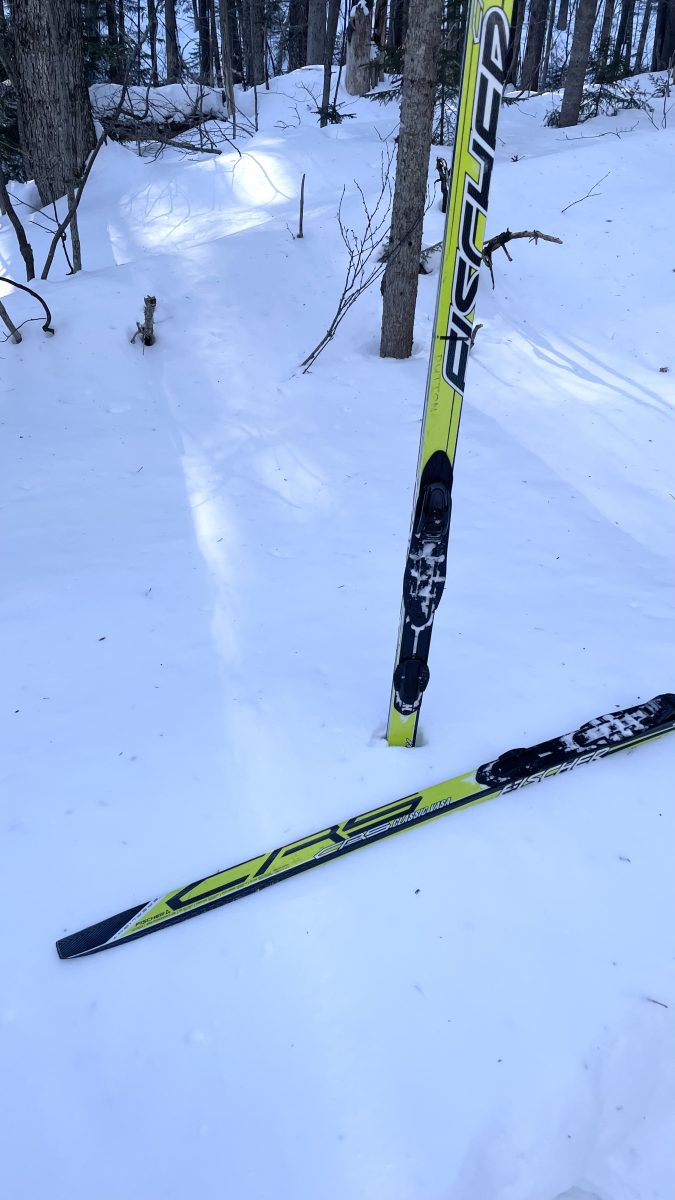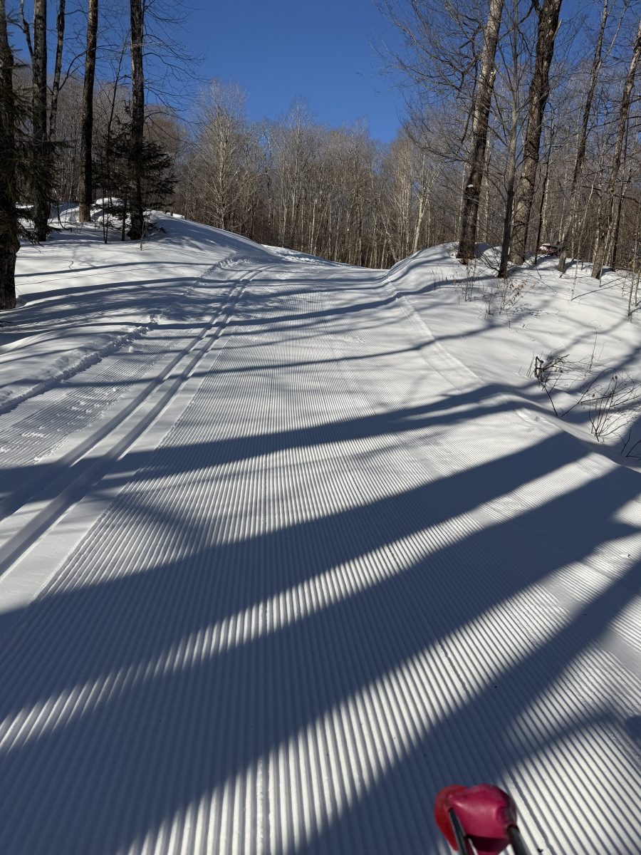 All photos in today’s post are from yesterday. The skiing is fabulous. Photos below, left to right, are: Peregrine, also Peregrine, Alex’s photo from her Ski All The Trails In One Day ski. The last is a photo of Cliff’s ski to measure the snow at Dick’s tree spot. Up on the top of the trail system, on Upper Blue Jay, Dick had a measuring tree marked for years but it rotted and fell over. Cliff used his ski to measure the snow pack there and it measured 21 1/2″.