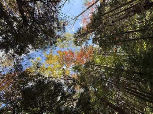 I do love this time of year. The layer of leaves on the ground, red and yellow. the crunchy leaves, the damp leaves. I love the smell. I love the cooler temperatures. I love standing in the woods and staring up. Fall leaves and blue sky or grey sky, I love both. The photos below are on the down track, and the Upper Blue Jay.
