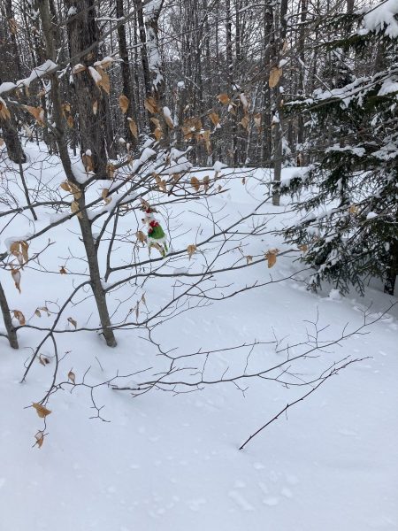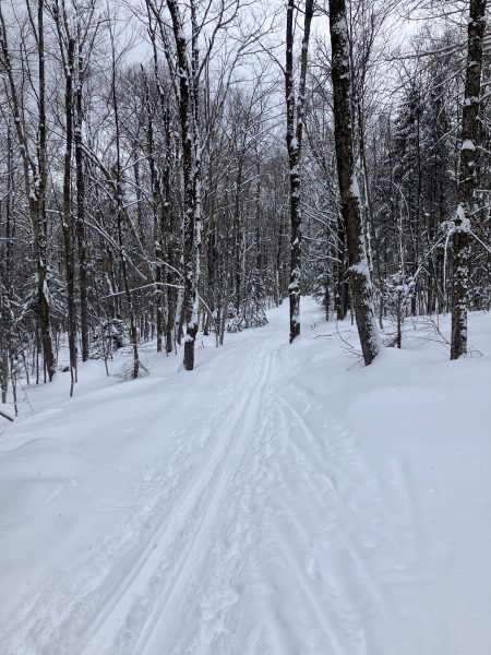The skiing is great. Low trails were groomed last night and he put in a great track and a nice firm skate lane, packed powder. The Chickadee described by Hilary as “superb, quiet and the snow is velvety smooth.”