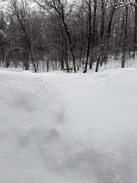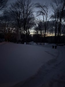 11º and the wind is blowing like crazy. Branches and ice chunks are falling. We did get a little snow overnight. A little more than a dusting.