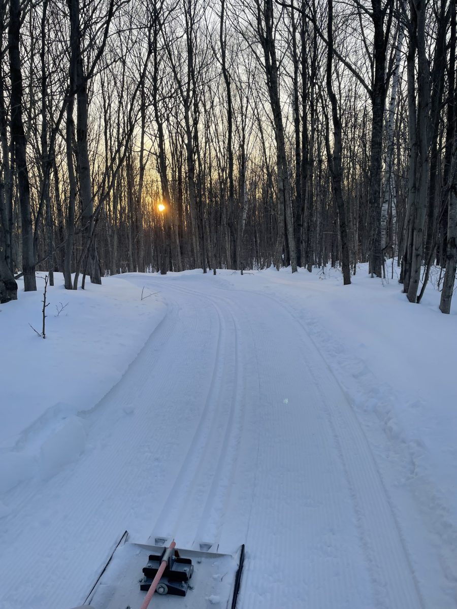 The sun is shining, the sky is blue, the snow is fabulous. Lower trails all groomed last night, upper trails groomed this morning.