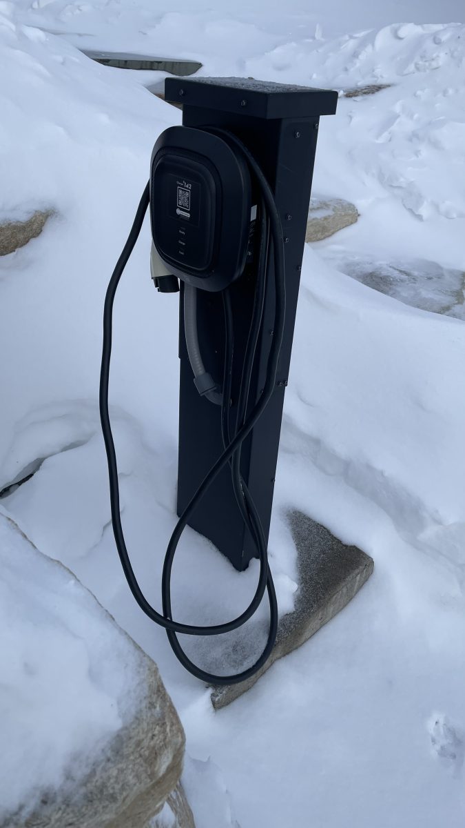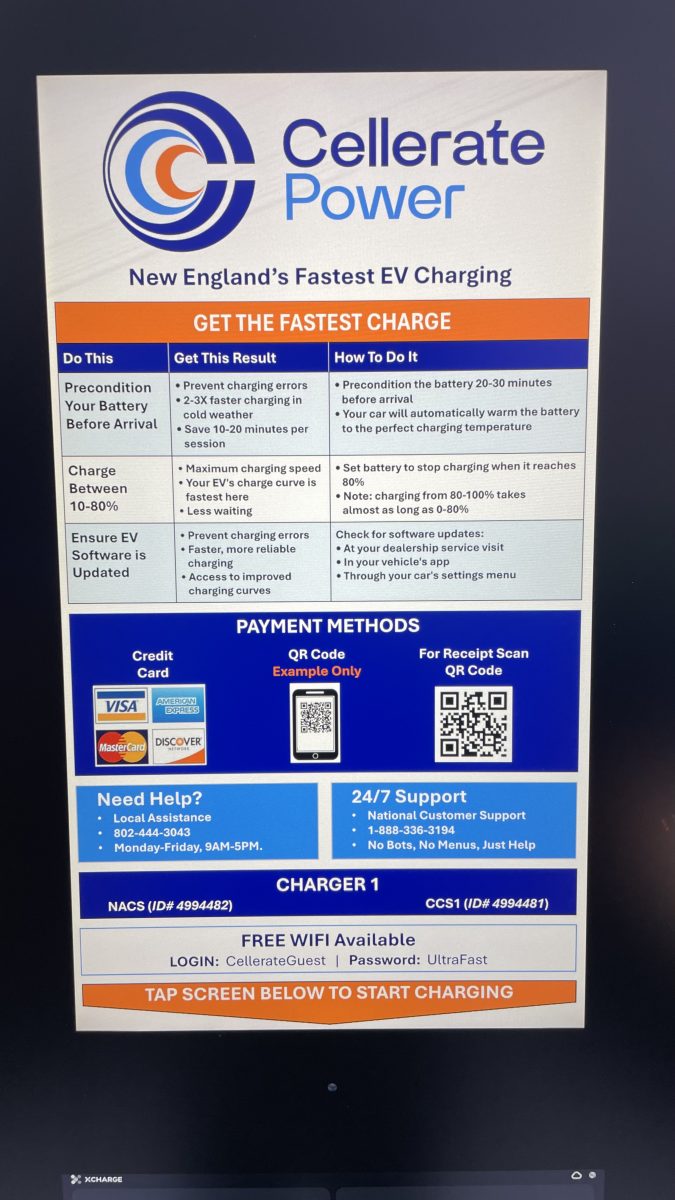 Likely the fastest charging station in New England as of this date. I suppose that’s why the owner posted charging recommendations suggesting you preheat your battery before arriving so you can utilize the 400kWs of power. Not many EVs can take that much but it is always good to preheat so you’ll get the fastest charge your car will allow. This station is near Stratton ski area so expect it to be busier when the lifts close. Of the 4 handles, 2 are NACS and 2 are CCS. Find it on PlugShare here. The app is called Monta Charge but there is a credit card reader that worked for me. Also there is WiFi provided by the station with access info posted in the charger’s suggestions as seen above. 40 VT-30, Winhall, VT 05340, USA. This could be the only station in Vermont that provides windshield squeegees and WiFi.