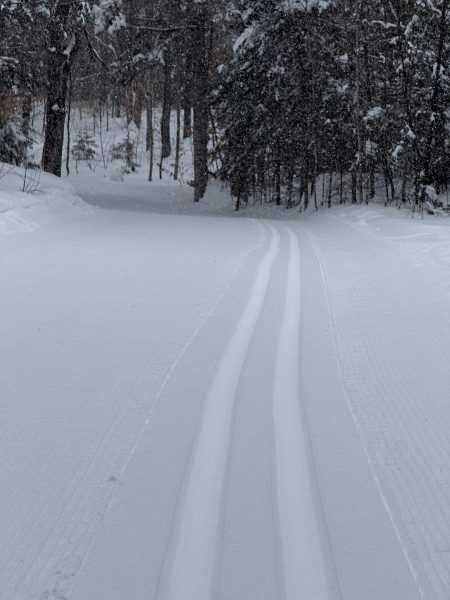 All trails groomed with a classed track, and low trails also have a skate lane. And a fresh coat of powdery, fluffy snow. Lovely skiing! The woods are beautiful and quiet. The trees are holding the snow. Groomers are out and about. Check in when you get here if you need specific on what was groomed this morning.