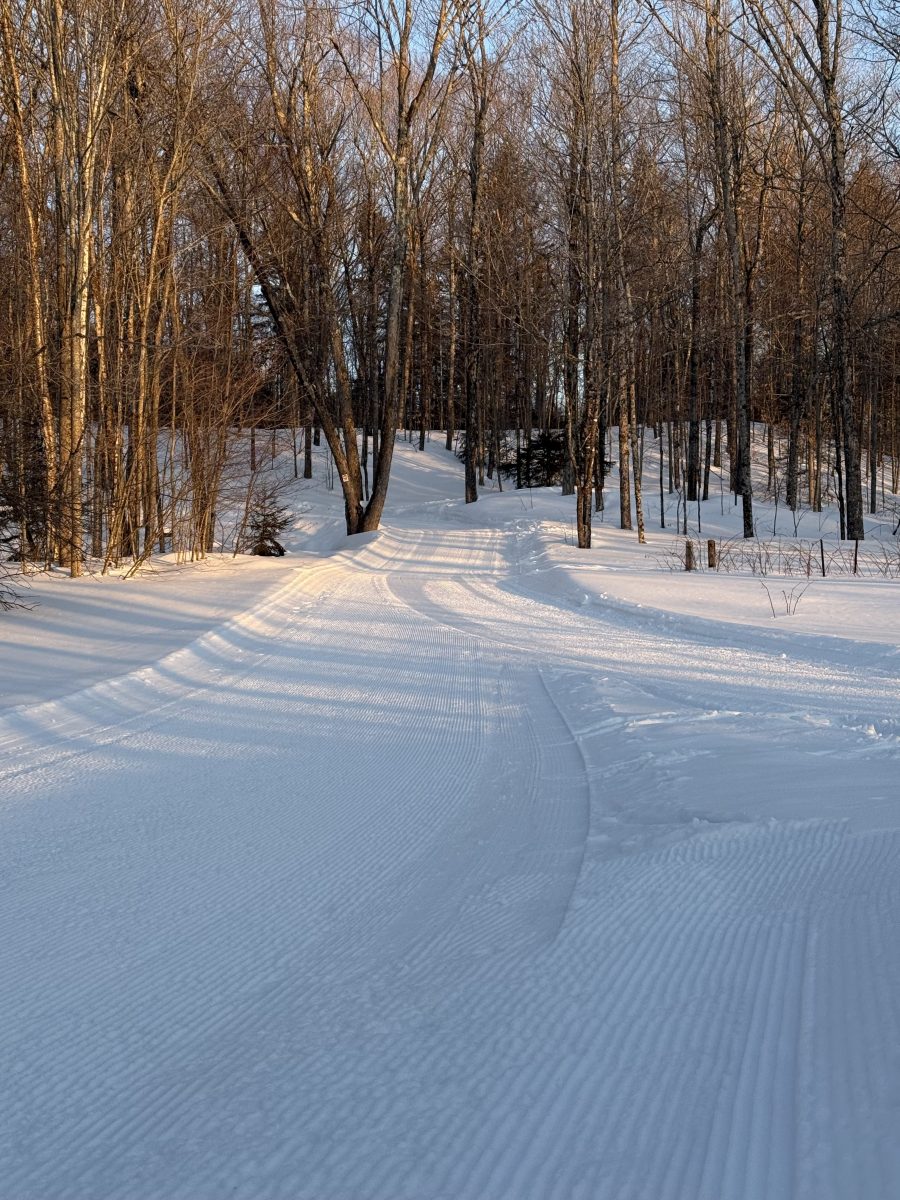 Grooming on the low trails last night left a lovely surface. The photos above are from this morning. It was cold out, but out to see the sunrise is a great way to start the day. Lovely skiing. Powdery hard pack.